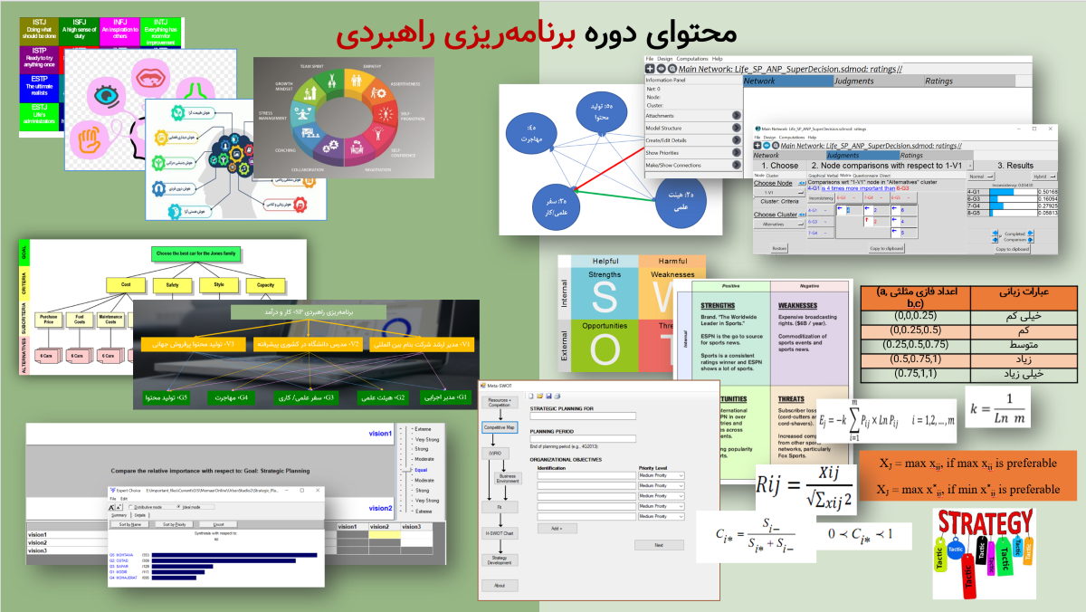 برنامه ریزی راهبردی | مدلها و روشها: SWOT/ Meta-SWOT/ Fuzzy/ AHP/ ANP/ DEMATEL/ SWARA/ Entropy Shannon/ ARAS/ TOPSIS | نرم افزارها: اکسل، اکسپرت چویس، سوپردسیژن و متاسوات